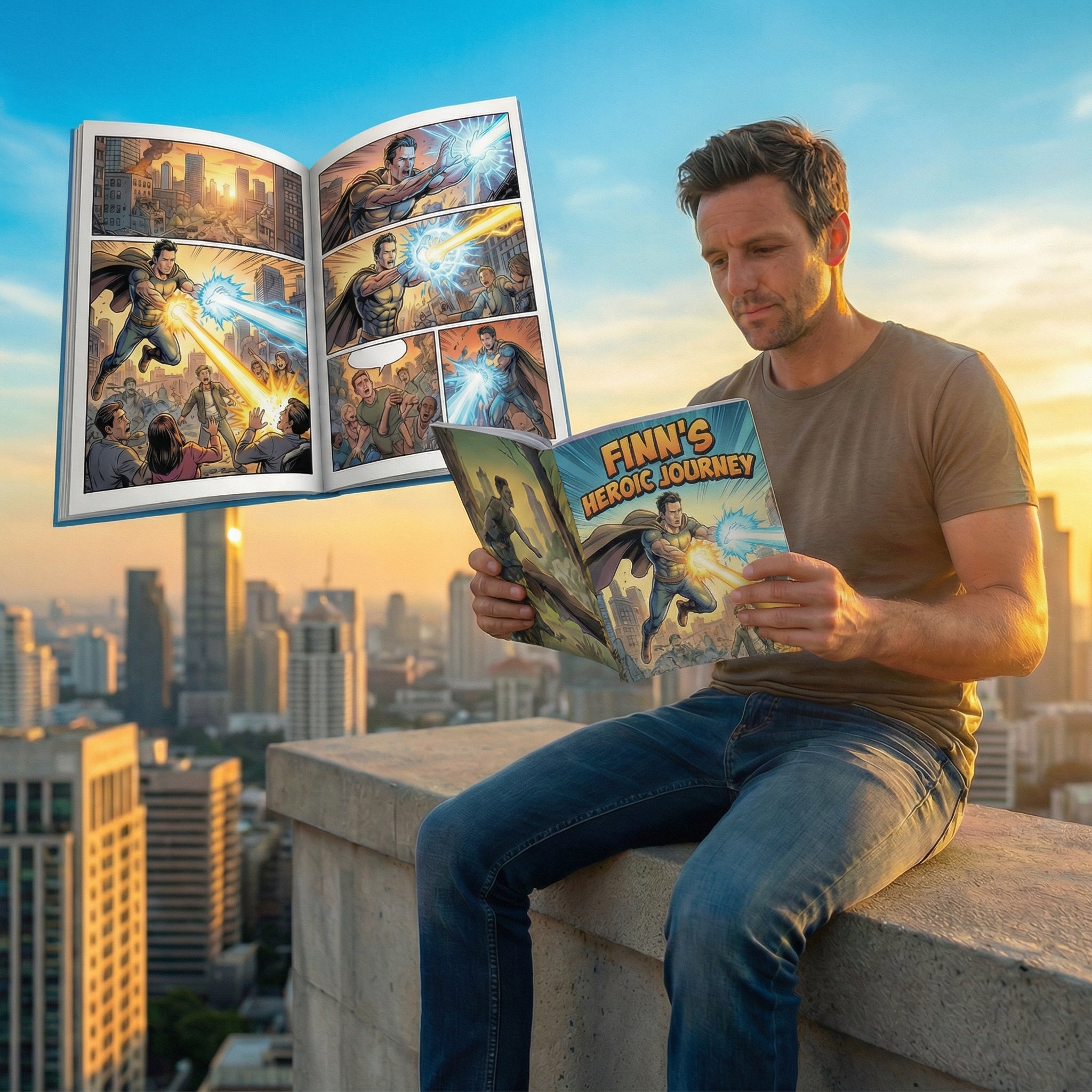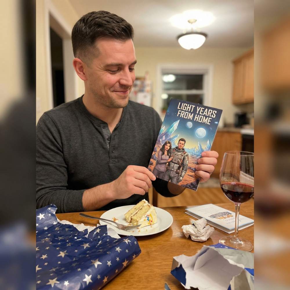 Surprised my husband with this for his birthday. The two of us as space explorers on a distant planet. He looked at the cover without saying a word, then quietly said "you actually turned us into a comic book." The way his face lit up when he recognized himself is something I won't forget. He keeps it on his nightstand and flips through it almost every night before bed.